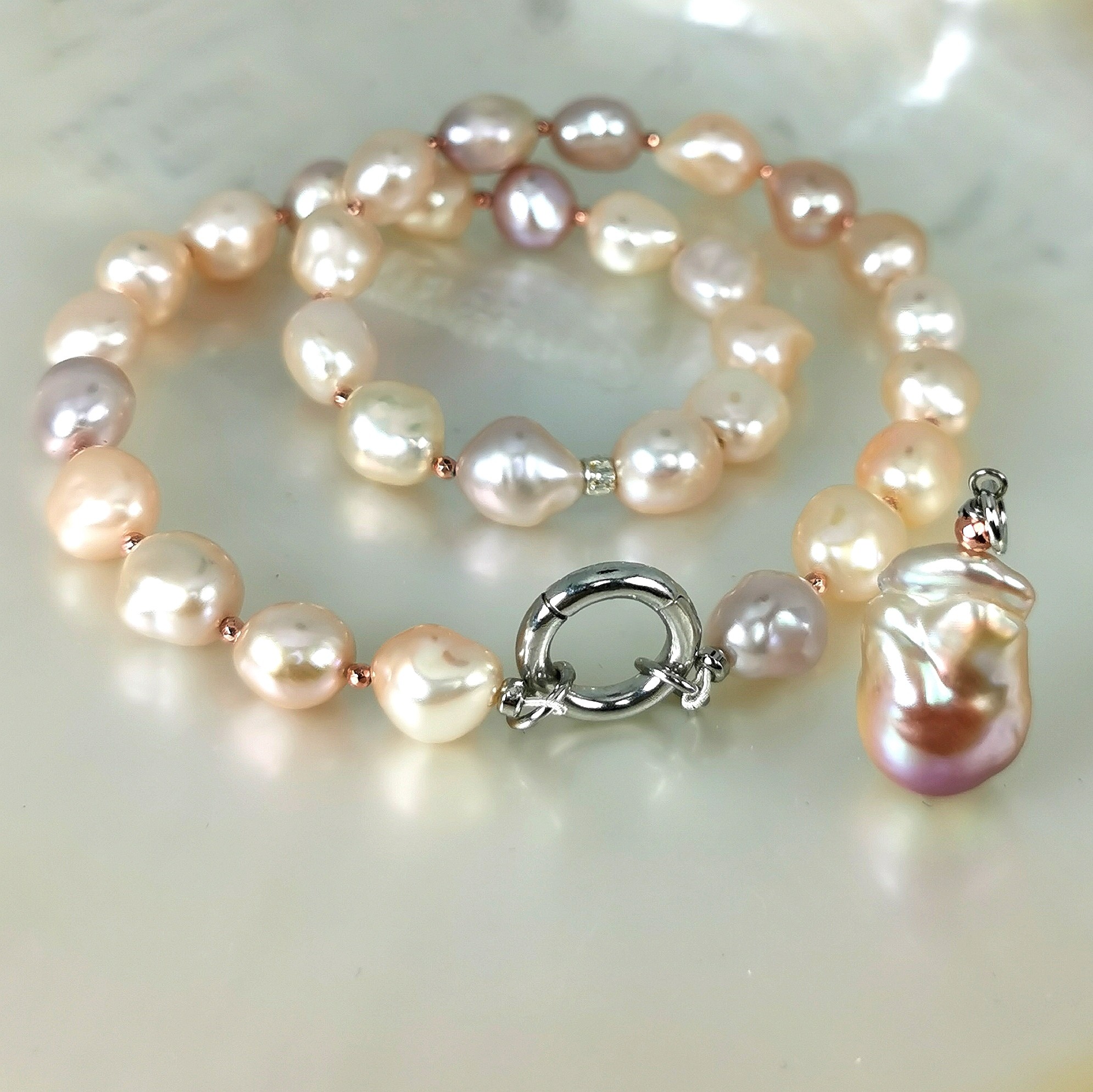 Perles de culture d’Eau douce baroques Ø 10 à 13,9 mm – 32 perles – 40 cm – pendentif détachable.